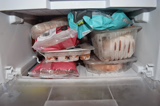 Our freezer is a jumble sale right now! We have a selection of meats, a couple whole chickens, beef mince, meatballs, pork joint, some fish, pork chops and some diced chicken.